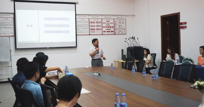圖一:總經(jīng)理助理高靜做2021上半年經(jīng)營業(yè)績回顧 ;圖二:工程管理部李麗作《施工階段工程變更成本控制工作指引》制度宣貫;圖三:結(jié)算部晏群作結(jié)算工作分享;圖四:設(shè)計部周宇航作集團新員工培訓(xùn)分享。