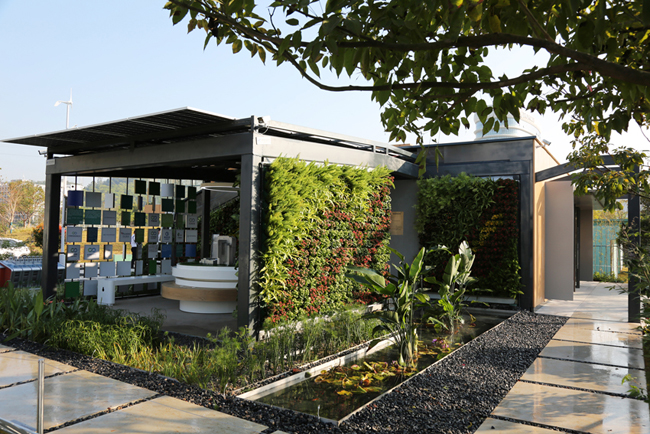 采用中節(jié)能鐵漢專利技術(shù)土非土基質(zhì)的垂直綠墻,為建筑在有限的空間里增加單位綠量,實(shí)現(xiàn)吸塵降塵、凈化空氣、隔熱節(jié)能功能,為展區(qū)增添生態(tài)亮點(diǎn)。